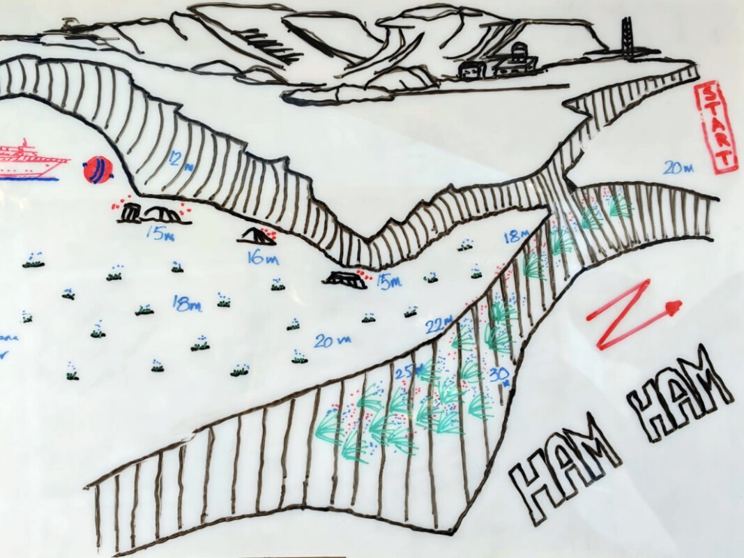 Guten Morgen von der Noras, mit dem besten Kapitän und seiner tollen Crew! Auf ging’s heute Morgen zum ersten Tauchgang nach Ham Ham für einen Drift zur Leine. Direkt beim Abtauchen an den Gorgonien sahen wir einen Langnasenbüschelbarsch, später einen Adlerrochen und viele Makrelen. Auf dem Plateau begegneten wir einem Napoleon, zahlreichen Muränen, Sergeants, Demoiselles, einem Drachenkopf und vielen Füsilieren.