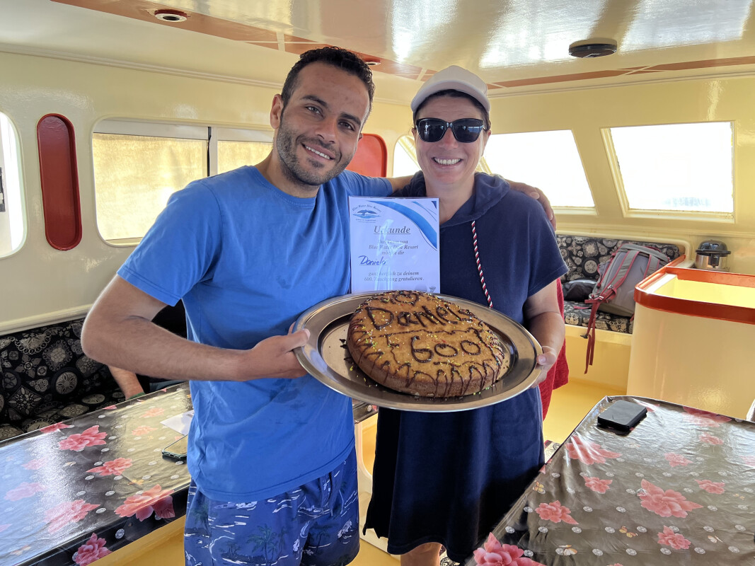 Nach dem ersten Tauchgang gab es Mittagessen, und das Essen war so lecker, dass es allen geschmeckt hat. Nach dem Mittagessen hatten wir 70 Minuten Oberflächenzeit und fuhren zum zweiten Tauchgang nach Shaab Quais Maksur zu einem stationären Tauchgang. Der Tauchgang war ebenfalls sehr schön und wir genossen die Korallenblöcke und die Unterwasserwelt. Wir sahen Krokodilfische, große Muränen, Steinfische, Glasfische, Thunfische und Kaiserfische, und alle Taucher fanden den Tauchgang sehr toll. Jetzt sind wir auf dem Rückweg zu unserem Tauchresort und treffen uns im ScuBAR, um das Logbuch zu schreiben, während unsere Gäste ein Bier genießen. Wir danken Kapitän Ahmed und seiner Crew für den tollen Tag und wünschen allen alles Gute. Liebe Daniela, herzlichen Glückwunsch zu deinem 600. Tauchgang!