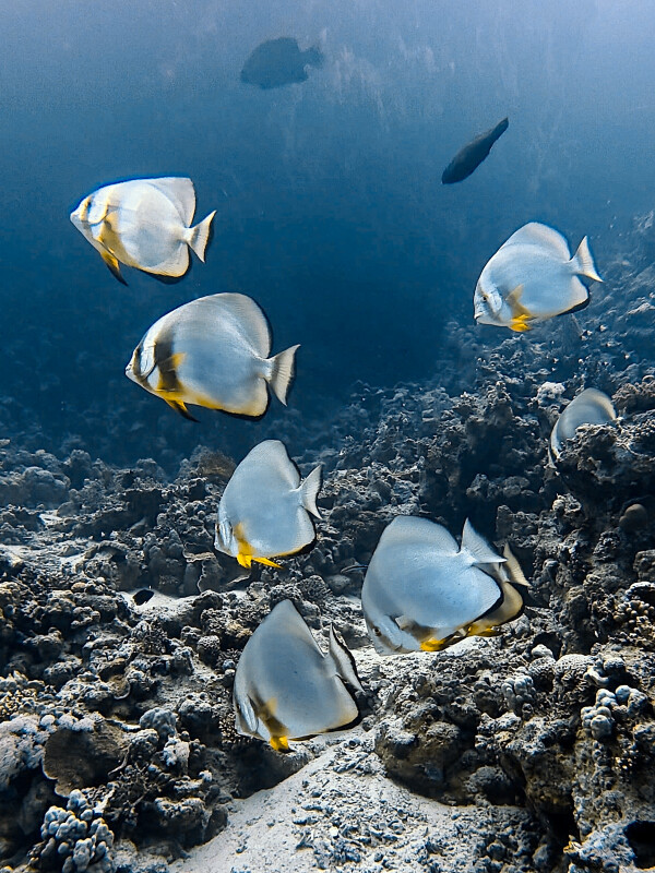 Nach einer entspannten Pause machten wir uns auf den Weg zu unserem zweiten Tauchplatz: Umm Gamar Nordwest, geplant als Drift Pick Up. Auch dieser Tauchgang war sehr gelungen. Die Sicht war weiterhin gut und die Strömung moderat. Wir schwebten über einen wunderschönen Korallengarten und entdeckten eine große Muräne, zahlreiche Blaupunktrochen, einen Schwarm Fledermausfische sowie viele Makrelen und Kugelfische. Das Highlight des Tauchgangs war jedoch eine beeindruckende Begegnung mit einem Delfin, der uns neugierig begleitete. Nach dem Tauchgang verbrachten wir noch eine kurze Zeit an Bord, bevor wir uns schließlich auf den Rückweg zu unserer Basis machten — mit vielen schönen Eindrücken eines rundum gelungenen Tauchtages im Gepäck.