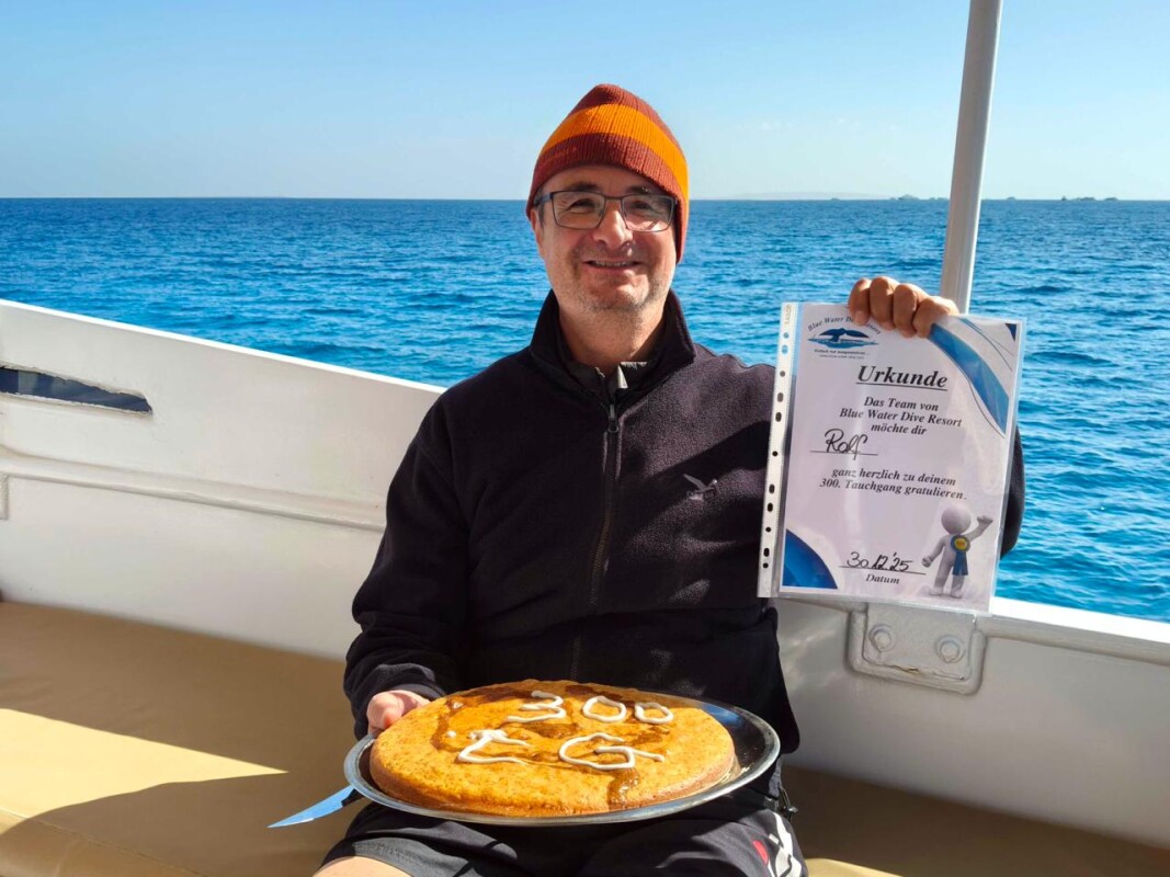 Nach dem Tauchgang gab es an Bord ein sehr leckeres Mittagessen – wirklich köstlich! Nach einer entspannten Pause ging es weiter zum zweiten Tauchplatz. Geplant war ein Tauchgang bei Shaab Abu Salama. Auch dieser Tauchgang war sehr schön, mit viel zu sehen: Steinfische, Skorpionfische, ein kleiner Napoleon, ein Schwarm Makrelen, Blaupunktrochen, ein Adlerrochen und ein Federschwanzrochen. Ein wirklich toller Tauchgang. Insgesamt war es ein sehr guter und entspannter Tag, den wir mit leckeren Getränken von der ScuBAR ausklingen ließen. Lieber Rolf, von uns allen herzliche Glückwünsche zu deinem 300. Tauchgang!