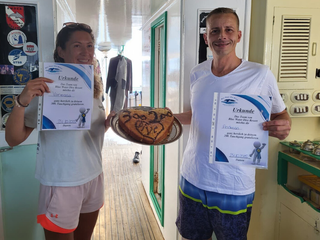 Nach einer Stunde Pause fuhren wir weiter zur Großen Giftun Insel, zum Tauchplatz Shaab Alex, für einen weiteren Drift Pick Up Tauchgang. Dort gab es ebenfalls viel zu sehen: drei Adlerrochen, drei Riesenmuränen, Glasgarnelen, einen Blaupunktrochen und Makrelenschwärme. Danach feierten wir gleich doppelt, mit Vanessa, die heute ihren 300. Tauchgang geschafft hat und mit Andreas, der seinen 200. Tauchgang absolvierte! Anschließend genossen wir ein leckeres Mittagessen sowie eine weitere entspannte Pause in der Sonne. Heute gab es köstliches Hühnchen zum Essen. Am Ende fuhren wir zurück zur Basis, wo Hassan bereits mit ein paar Bieren auf uns wartete. Auf Vanessa und Andreas – Prost!