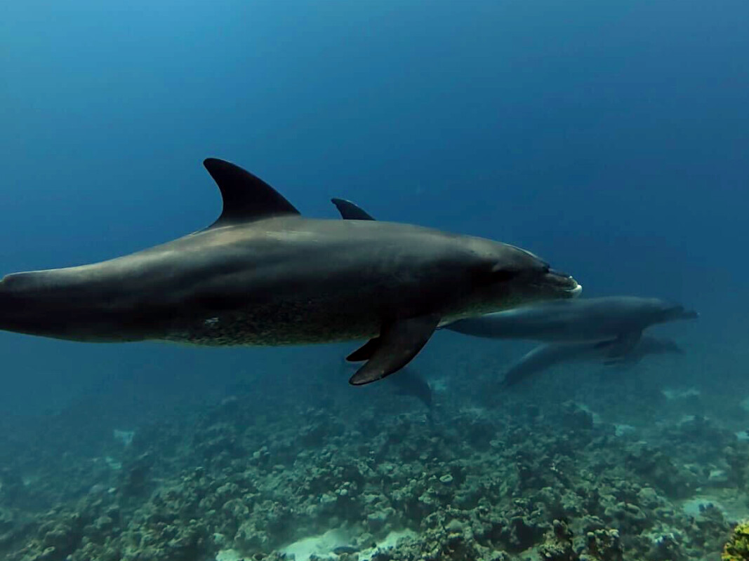 Doch das große Highlight wartete am Ende des Tauchgangs auf uns: Vier verspielte Delfine begleiteten uns die letzten 30 Minuten, spielten mit uns und tauchten durch uns hindurch – was für ein sensationeller Tag! Nun geht es ab in die ScuBAR, um auf diesen wunderbaren Tag anzustoßen!