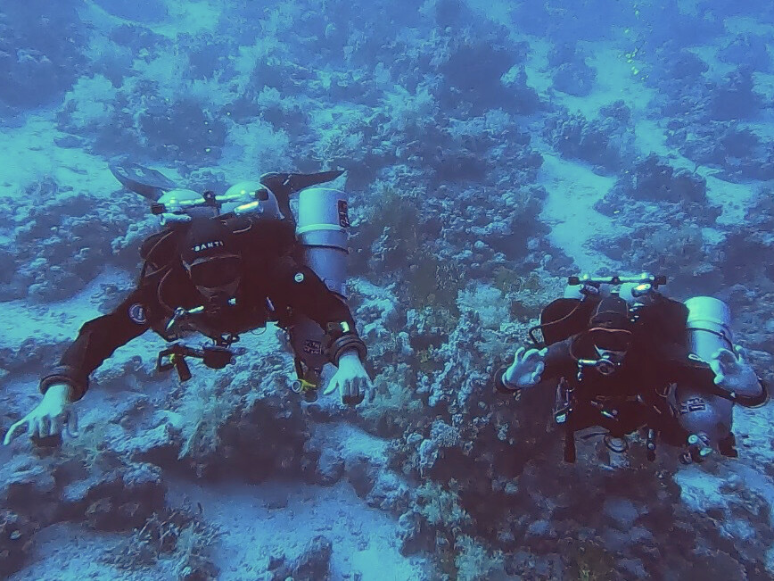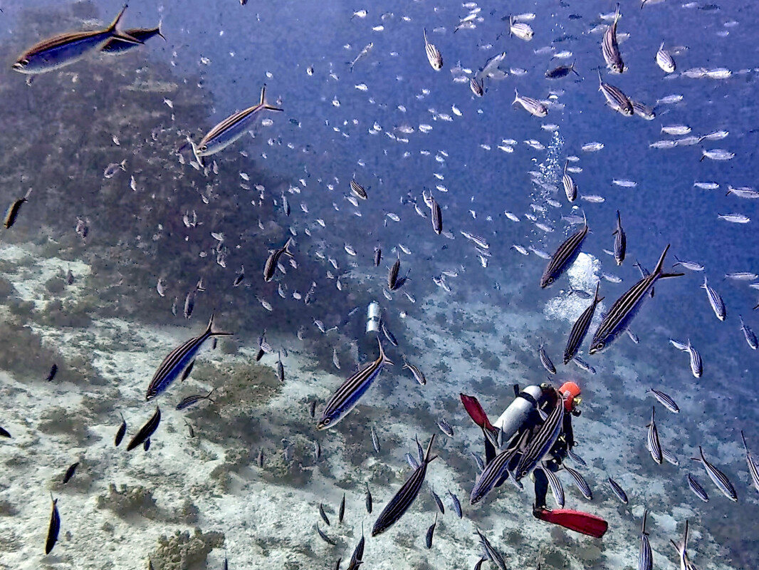 Ein besonderes Highlight war die große Gruppe Fledermausfische, die uns eine ganze Weile neugierig folgte. Zum krönenden Abschluss zeigte sich noch ein beeindruckender Milchfisch, der gemächlich entlang des Hauptriffs vorbeizog. Etwas tiefer unten, beim Tec40-Kurs, wurde zudem ein großer Adlerrochen gesichtet. Nach zwei erfolgreichen Tauchgängen machten wir uns zurück zur ScuBAR, wo wir den gelungenen Tag bei einem kühlen Getränk ausklingen lassen und unsere Logbücher schreiben. Außerdem möchten wir Thomas ganz herzlich zum bestandenem Tec40-Kurs gratulieren! Wir wünschen dir weiterhin viel Freude in der Tiefe und immer gut Luft!