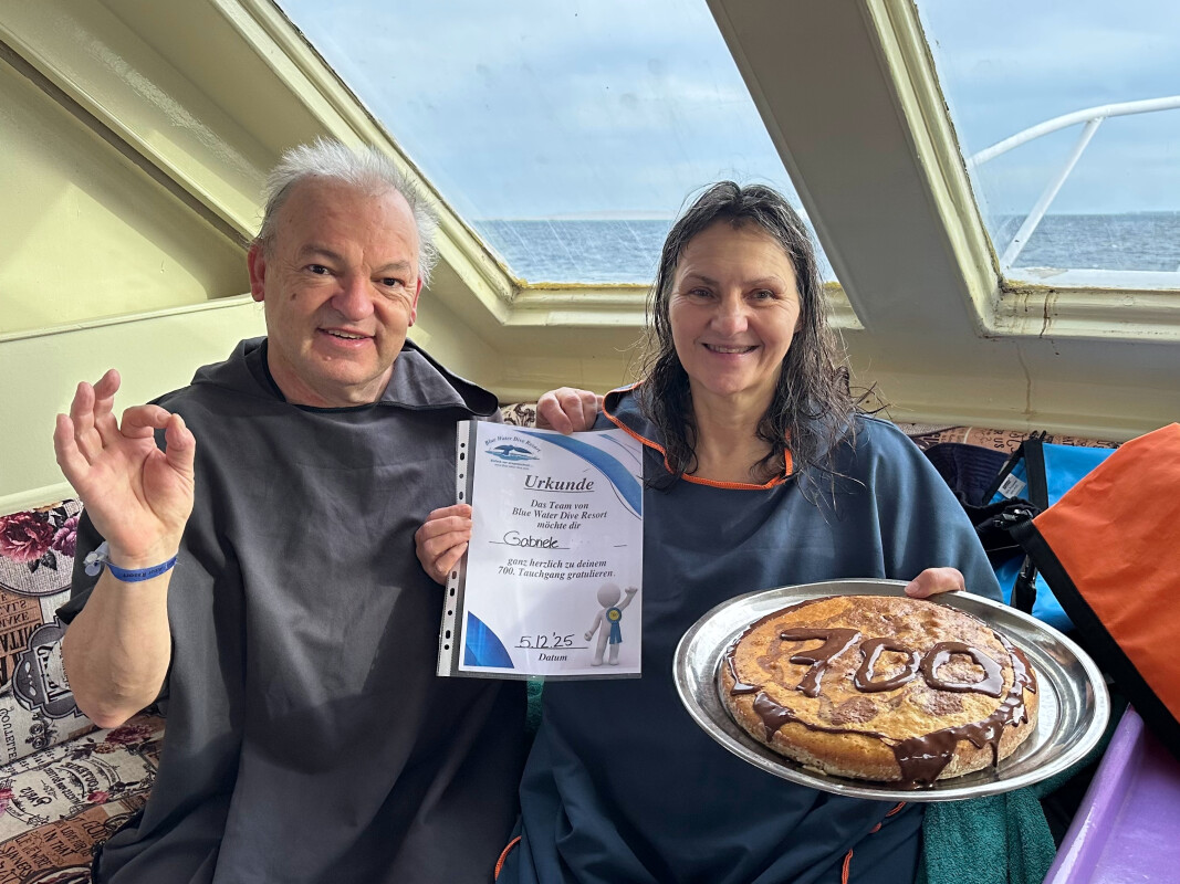 Nach einem leckeren Mittagessen ging es weiter zum zweiten Tauchgang nach Shaab Samir. Dort sahen wir jagende Makrelen, Blaupunktrochen, Papageienfische, Flötenfische, eine kleine Pyjama-Nacktschnecke sowie zwei große Exemplare derselben Art. Zurück auf dem Boot feierten wir dann etwas ganz Besonderes: den 700. Tauchgang von Gabriele! Zu diesem Anlass überraschte uns die Crew sogar mit einem frisch gebackenen Kuchen. Ein rundum erfolgreicher Tauchtag geht nun zu Ende – und wie es sich gehört, wird bei Hassan in der ScuBAR erst einmal mit einem Dekobier angestoßen.