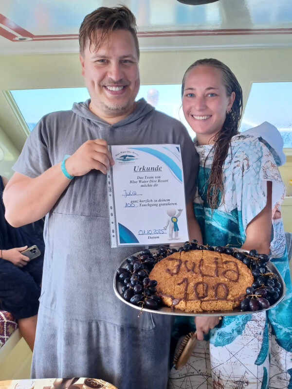 Zurück an Bord gab es ein köstliches Mittagessen, das wir uns mehr als verdient hatten. Unser letzter Tauchgang führte uns an die Balena, ein schönes Wrack in maximal 8 Metern Tiefe. Dort fanden wir zahlreiche Pyjama- und Hübsche Sternschnecken, einen Schwarm Barrakudas, Feuerfische, Blaupunkt-Stechrochen, Kugelfische, einen großen Krokodilfisch, Seenadeln und Garnelen. Ein rundum perfekter Tauchtag! Vielen Dank an unseren Kapitän und die ganze Crew – ihr wart wie immer herzlich, hilfsbereit. Ihr seid einfach die Besten! Herzlichen Glückwunsch, liebe Julia zu deinem 100. Tauchgang!