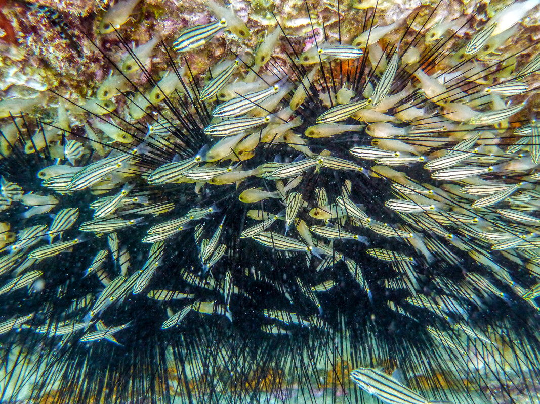 Guten Morgen von der Bella Italia. Unsere Einsteigertour ging heute nach Fanadir Foc. Dort fanden wir einen Steinfisch, einen Fransendrachenkopf, mehrere Igelfische, ein Pärchen Fledermausfische und viele Rotzahn-Drückerfische. Wir waren schon unter dem Boot, als plötzlich vier Delfine - zwei Mütter mit jeweils einem Kalb - auftauchten und im Halbschlaf mehrere Runden um uns drehten.