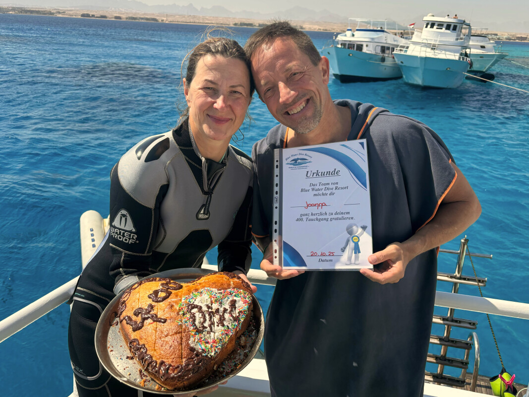 Zurück an Bord wurden wir mit einem leckeren Mittagessen verwöhnt und es gab einen besonderen Anlass zum Feiern, Joanna absolvierte heute ihren 400. Tauchgang! Die Crew überraschte sie mit einem selbstgebackenen Kuchen. Wieder an der Basis angekommen, wartete Hassan bereits in der ScuBAR mit dem wohlverdienten Dekobier auf uns. Ein wunderschöner Tag auf der El Noras – voller toller Begegnungen und guter Laune!