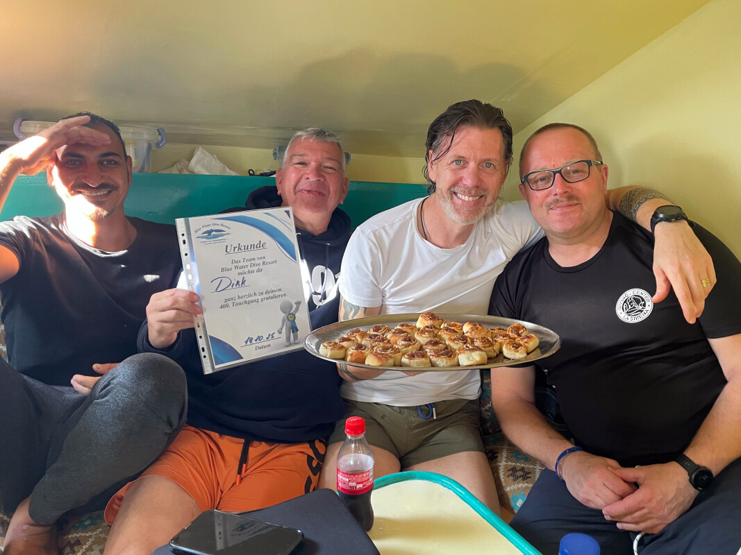 Für den zweiten Tauchgang nach der Mittagspause mit dem leckeren Essen vom Buffet erkundeten wir Shaab Tiffany. Hier trafen wir auf einen Augenfleck-Mirakelbarsch, eine Hübsche Sternschnecke, viele Seenadeln, einen Torpedorochen, einen Fransendrachenkopf, ein paar große Hornhechte, viele gelbe Meerbarben und Beilbauchfische und eine Rußkopfmuräne. Für Dirk war das sein 400. Tauchgang – herzlichen Glückwunsch! Darauf stoßen wir jetzt in der ScuBAR an. Happy Bubbles, Andrea & Abdo!