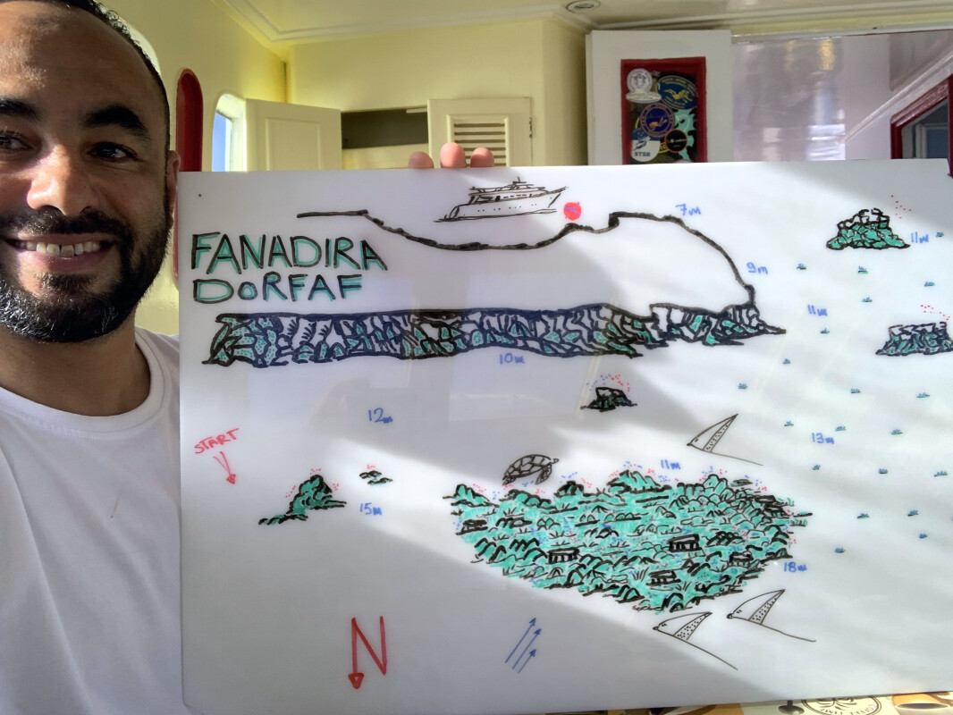Nach dem Tauchgang hatten wir Zeit zum Entspannen und genossen ein sehr leckeres Essen auf dem Boot. Während des Mittagessens wurde viel diskutiert und man freute sich schon auf den zweiten Tauchgang. Nach dem Briefing tauchten wir bei Fanadir Dorfa als Drift zur Leine. Aufgeregt sprangen die Taucher ins Wasser und wurden sofort von einem wunderschönen Blaupunktrochen begrüßt. Wir sahen drei große Muränen, von denen eine sogar ihre Höhle verließ. Außerdem entdeckten wir Steinfische, eine farbenreiche Nacktschnecke, einen jagenden Riesen-Jackfish, einen Fledermausfisch, drei Federschwanzstechrochen, einen Adlerrochen, mehrere Kugelfische und eine Schildkröte. Kurz vor Ende des Tauchgangs erschien eine kleine Gruppe von fünf Fledermausfischen, die uns fast wie zum Abschied begleitete. Danach kehrten wir zum Boot zurück und genossen die Rückfahrt. Vielen Dank für einen wunderschönen Tag. Liebe Grüße Samir