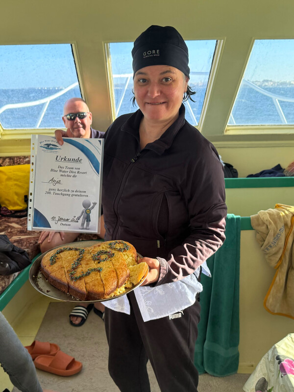 Zurück an Bord wurde kurze Zeit später das Mittagessen serviert, es war sehr lecker und hervorragend zubereitet. Nach einer entspannten Mittagspause fuhren wir weiter zum zweiten Tauchplatz. Für den zweiten Tauchgang des Tages stand Shaab Samir auf dem Plan. Auch dieser Tauchgang war großartig, mit viel zu entdecken: Stein- und Skorpionfische, ein kleiner Napoleon, zahlreiche Stachelmakrelen, ein großer Adlerrochen und ein traumhafter Korallengarten. Es war ein sehr schöner und entspannter Tag, den wir mit leckeren Drinks an der ScuBAR ausklingen ließen. Liebe Anja, von uns allen herzliche Glückwünsche zu deinem 200. Tauchgang!