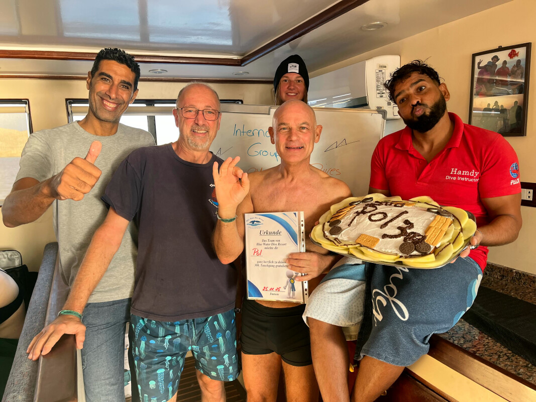 Nach dem Mittagessen ging es für uns nach Shaab Sabina. Wir fanden hier eine Gruppe von kleinen Barrakudas. Plötzlich schwamm an uns ein Manta-Rochen vorbei. Wir konnten unser Glück kaum fassen! Während unseres Tauchgangs fanden wir Thunfische, Blaupunktrochen und Clownfische. Pol machte heute seinen 300. Tauchgang. Hierfür bereitete die Crew einen Kuchen vor. Auf dem Boot zurück wurde ordentlich gefeiert. Ein schöner und erfolgreicher Tag mit der International Group geht zu Ende. In der Tauchbasis wartete Hassan bereits in der ScuBAR mit Dekobier auf uns.