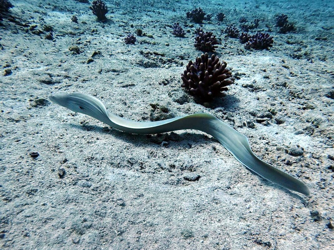 Nach einer entspannten Mittagspause, in der die Mägen wieder gefüllt wurden und die Sonne genossen werden konnte, ging es weiter zum zweiten Tauchgang. Bei Fanadir Foc stand ein Drift Dive zur Leine auf dem Plan. Dort begegneten wir Steinfischen, einem freischwimmenden Schlangenaal, weiteren Makrelen und riesigen Muränen. Außerdem konnte Louis heute erfolgreich seinen Open Water Diver Kurs mit Hamdy als Tauchlehrer abschließen – herzlichen Glückwunsch und allzeit gute Tauchgänge!